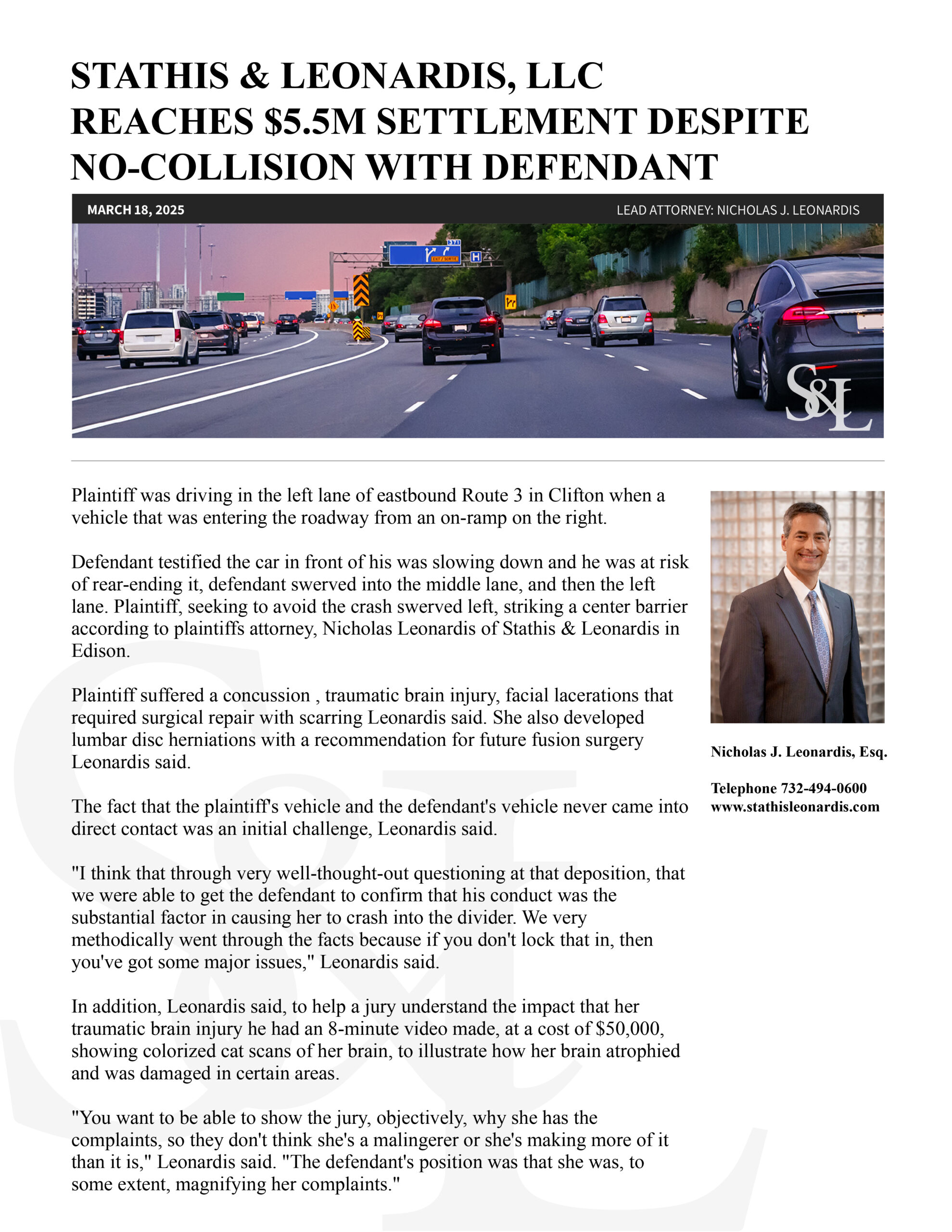 A $5.5 million settlement has been reached for a client in a no-collision accident. The plaintiff was represented by Nicholas J. Leonardis of Stathis & Leonardis in Edison.
